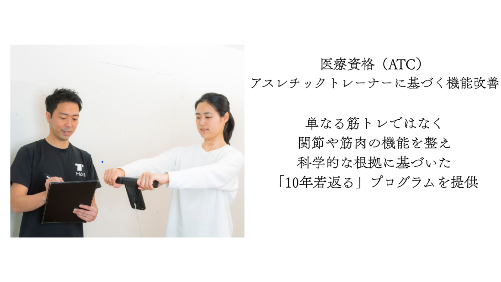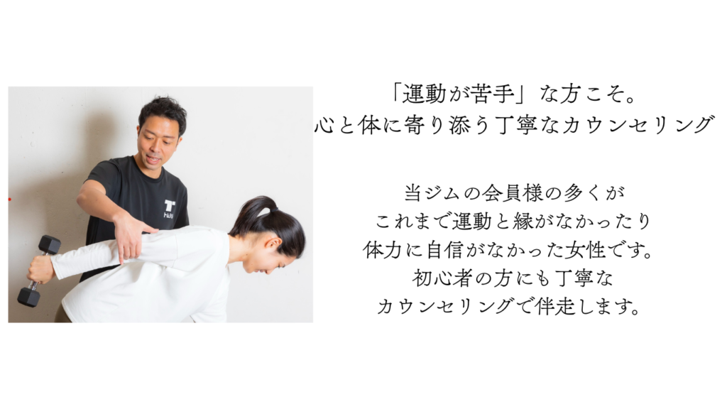 ご安心ください。当ジムの会員様の7割が、運動経験が少ない女性です。いきなりハードなトレーニングは行いません。まずは医学的資格(ATC)を持つトレーナーが、お体の柔軟性や関節の動きをチェックし、お一人おひとりの体力に合わせた「心地よい」メニューからスタートします。