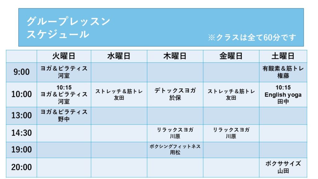 12月よりトムジムのグループレッスンをリニューアルします!スケジュールは以下の通り。